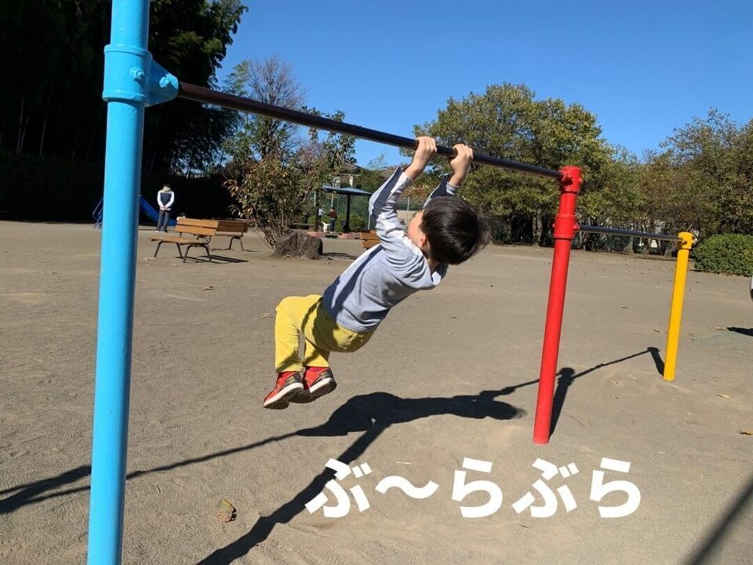 ただ、鉄棒にぶら下がるだけでも、子どもにとっては、日常では味わえない楽しい感覚です。
