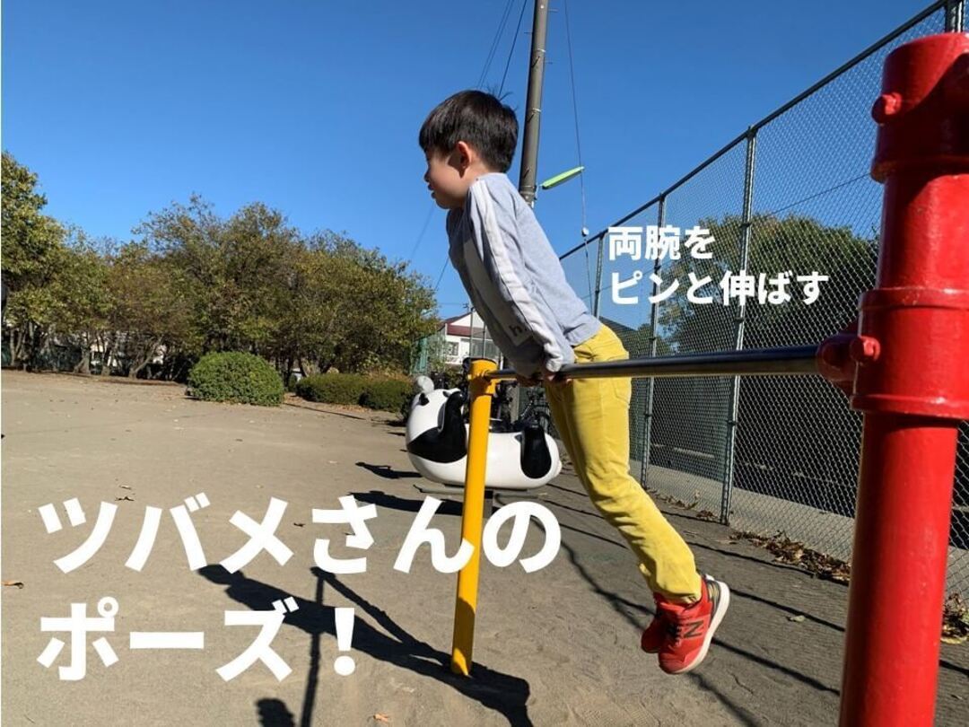 まずは、軽くジャンプして鉄棒に飛び乗り、おへその下あたりを鉄棒にくっつけて「ツバメさんのポーズ」をとらせます。