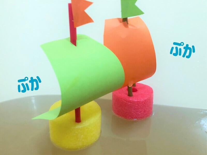 輪切りのプールスティックにストローをさし、画用紙の帆をつければヨットに!水をかきまぜたり、大きな波を作っても意外と転覆せずにプカプカと浮くので、見ているだけで癒されます♪ふたつヨットを作って、息をふきかけ競争させるのもいいですね。