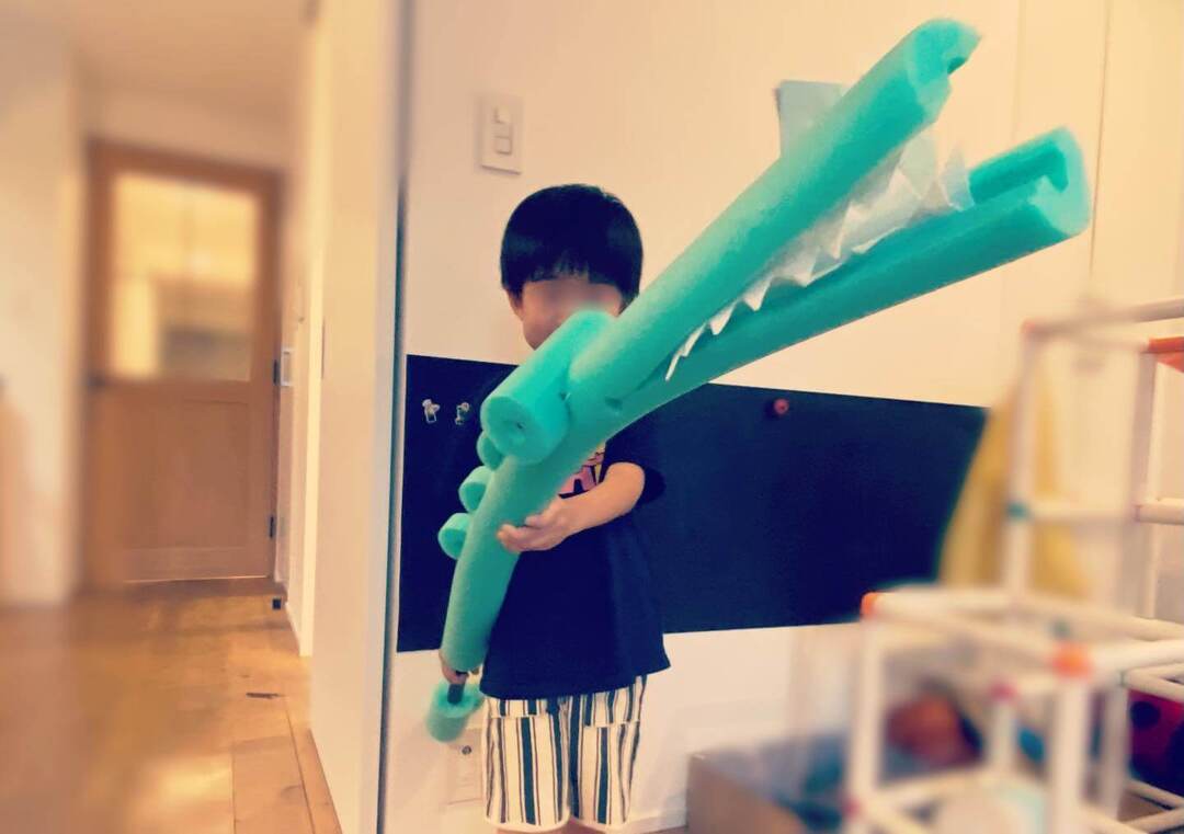 mito_pa_paさんがふたりのお子さんのために作ったのは、生き物剣!上から魚剣・タコ剣・ヘビ剣だそう。剣の持ち手部分は中心を空けたスポンジブロックに、黒いカラービニールテープをまきつけたサランラップを組み合わせてできています。
