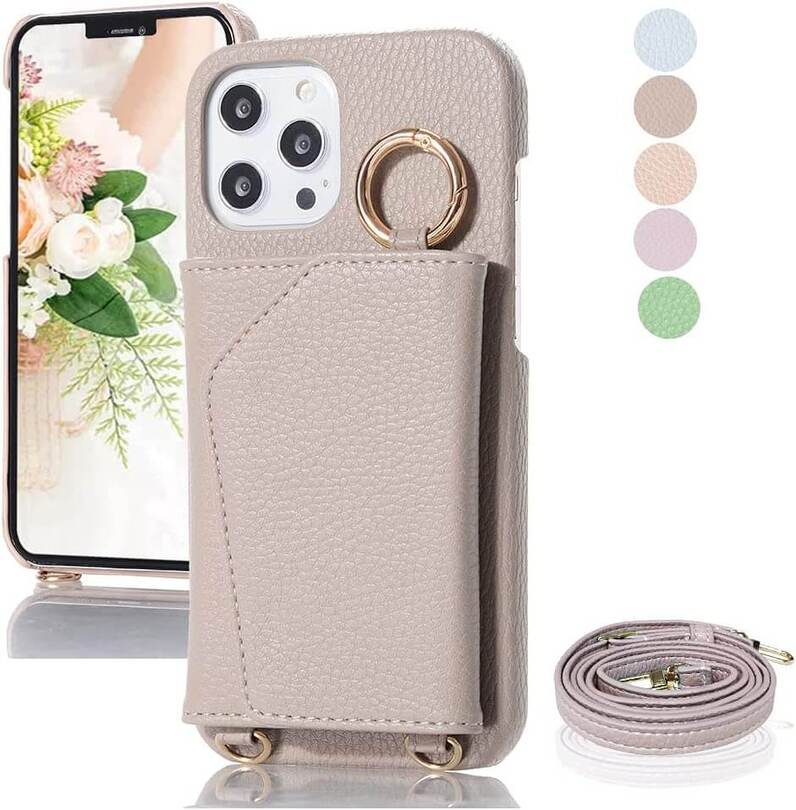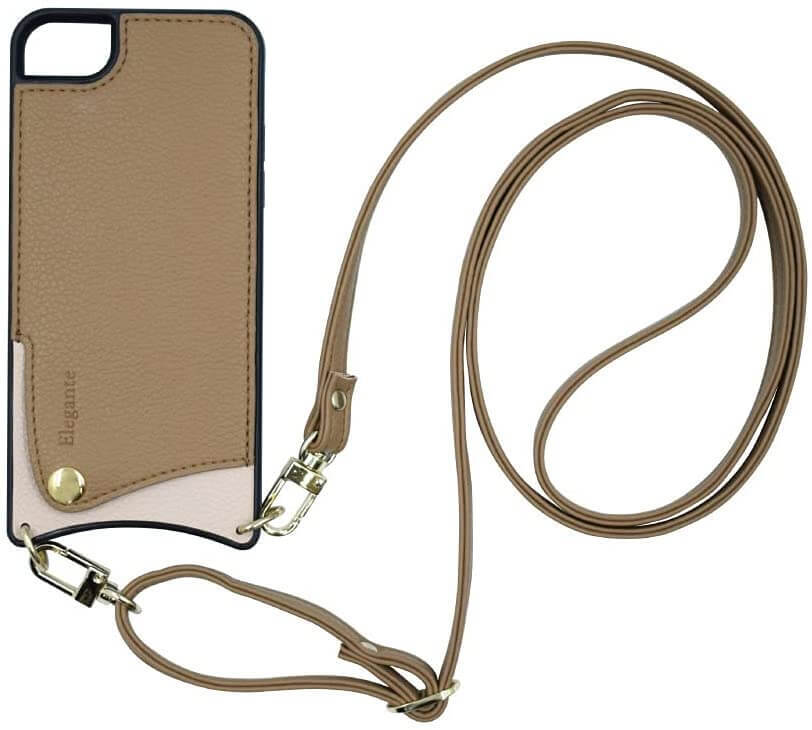 iPhone7~12まで対応のハードケースタイプのスマホショルダー。背面にはカードが1枚入る収納ポケットがついています。スナップ付きなので落下の心配なし。カードを入れたままタッチ決済が可能です。レザータッチとバイカラーがおしゃれなデザインは、オフィスでも活躍しそうです。
