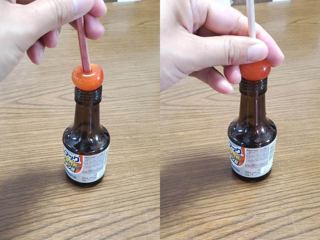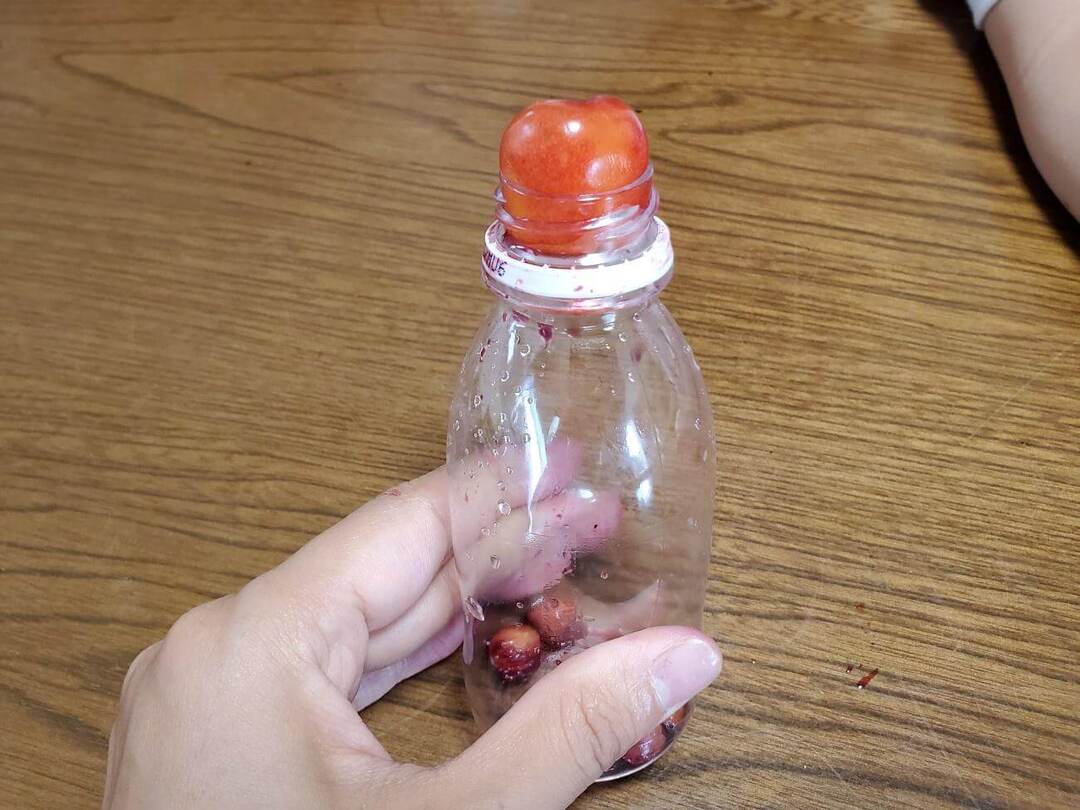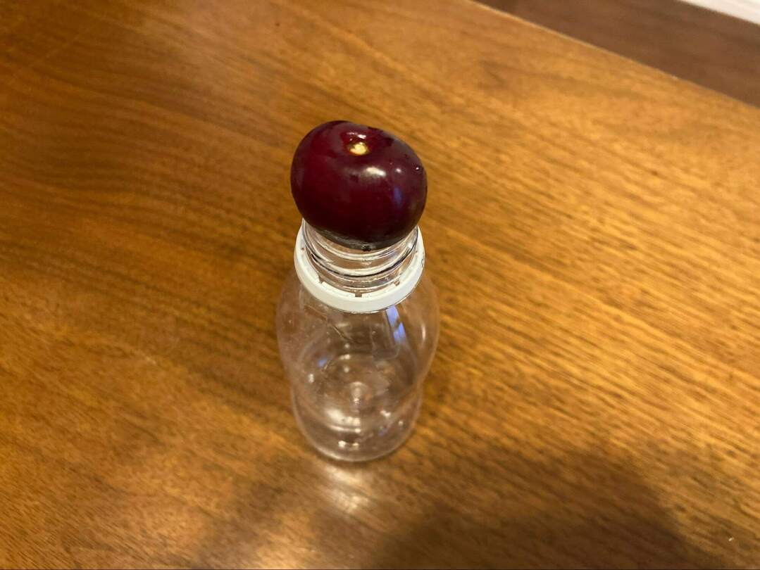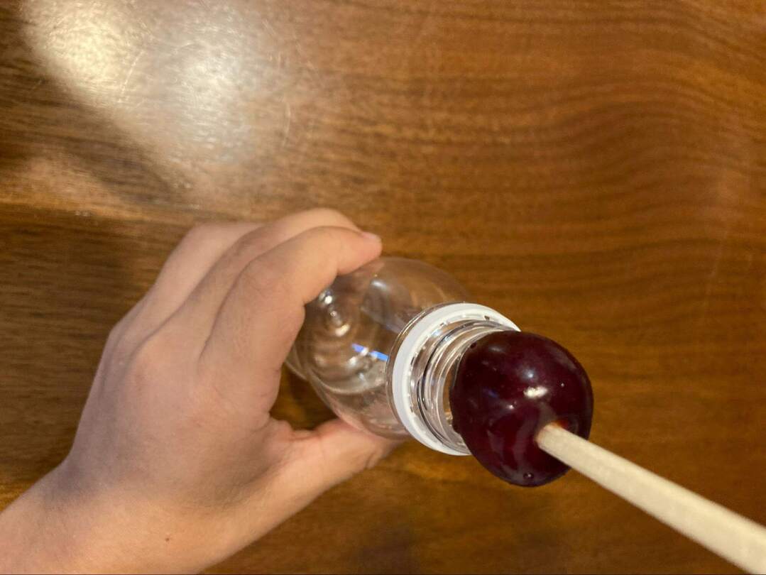 種の取り方は簡単です。まずボトルの口の上にさくらんぼの実を柄があった部分が上になるように置きます。