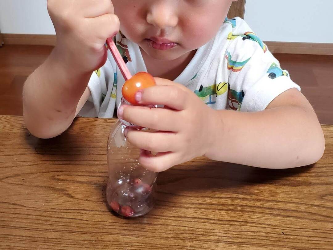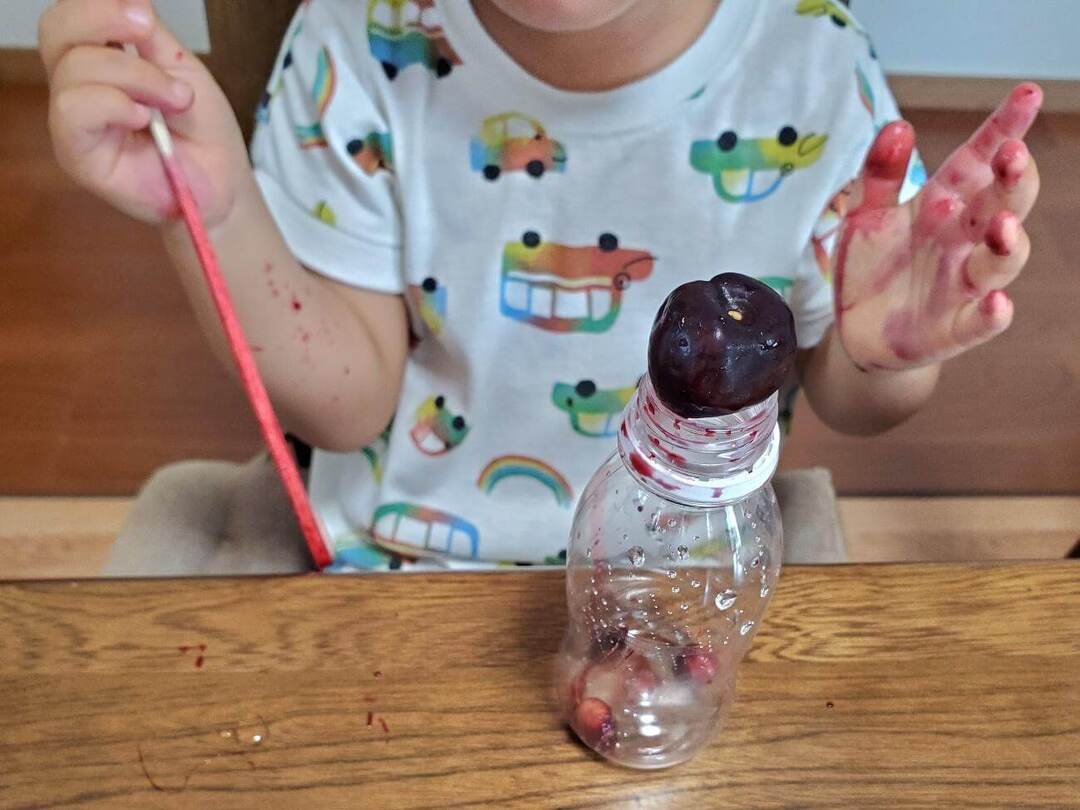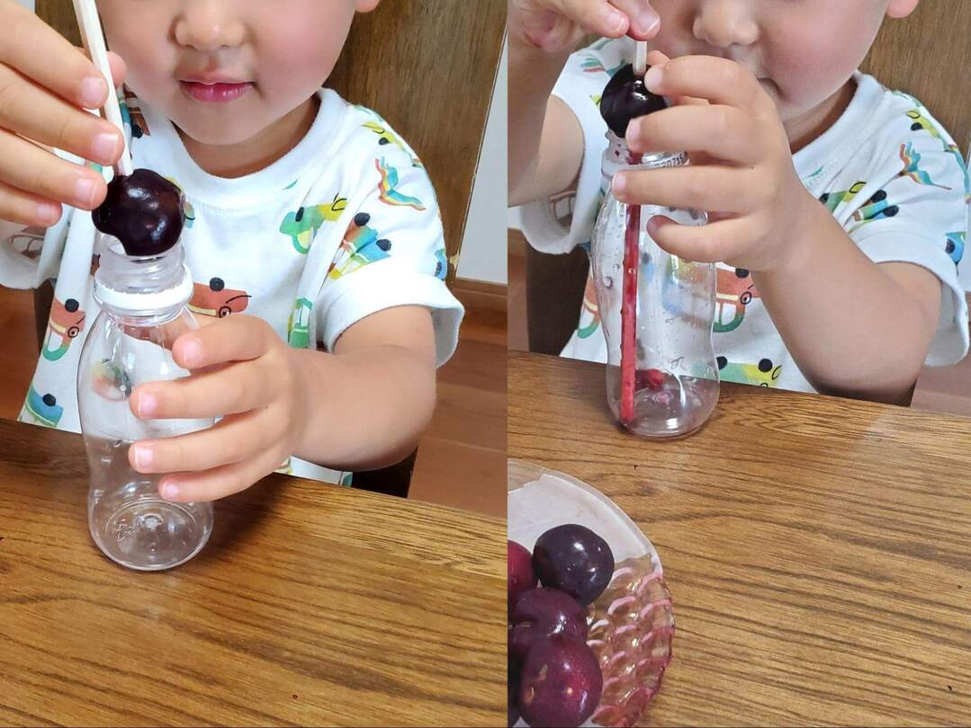 さくらんぼの実はやわらかいので、3歳の息子でも突き刺すことができました。1回目にしてあっけなく成功!