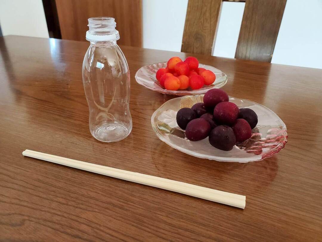 さくらんぼの種取りに必要なのは、口の狭いボトルと箸。どの家庭にもありそうなものだけです。 今回は割り箸で挑戦します。あらかじめ柄の部分を取ったさくらんぼとアメリカンチェリーの2種類を使って試していきましょう。