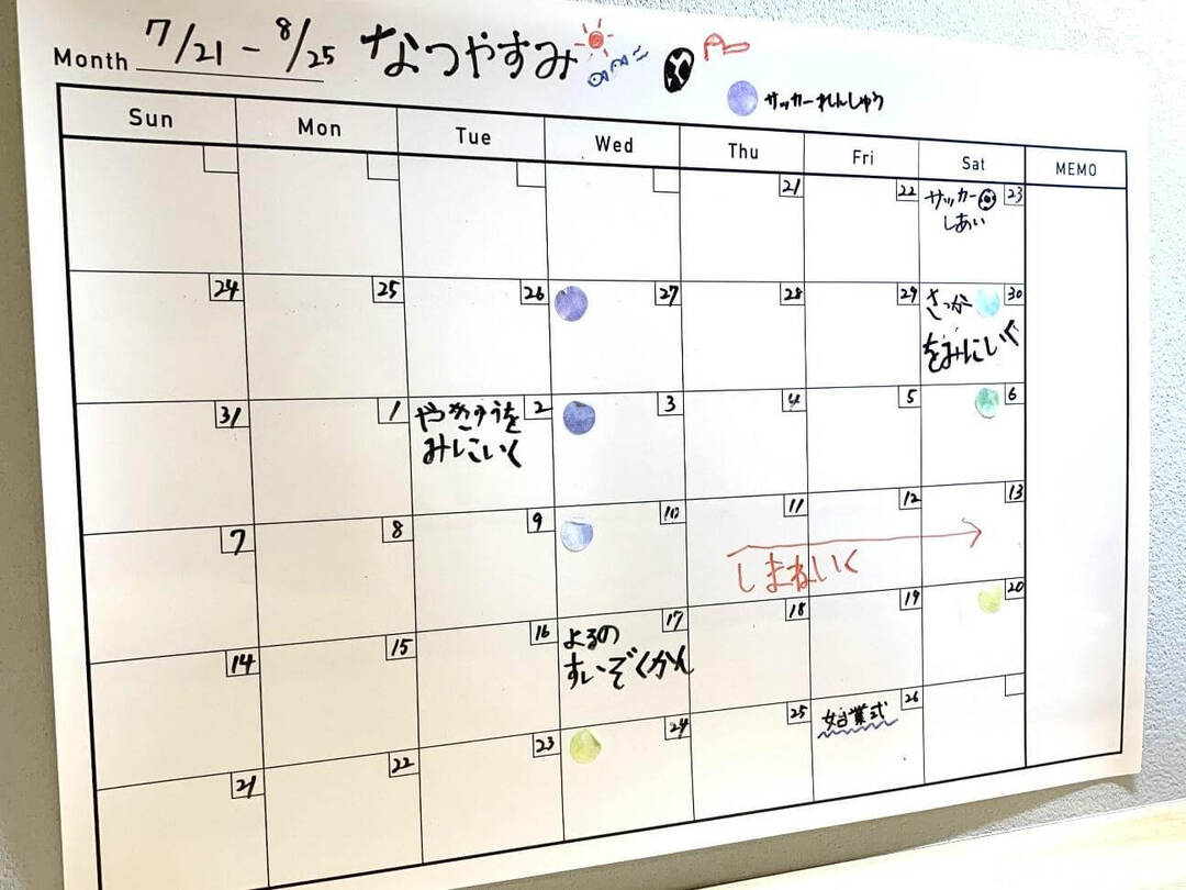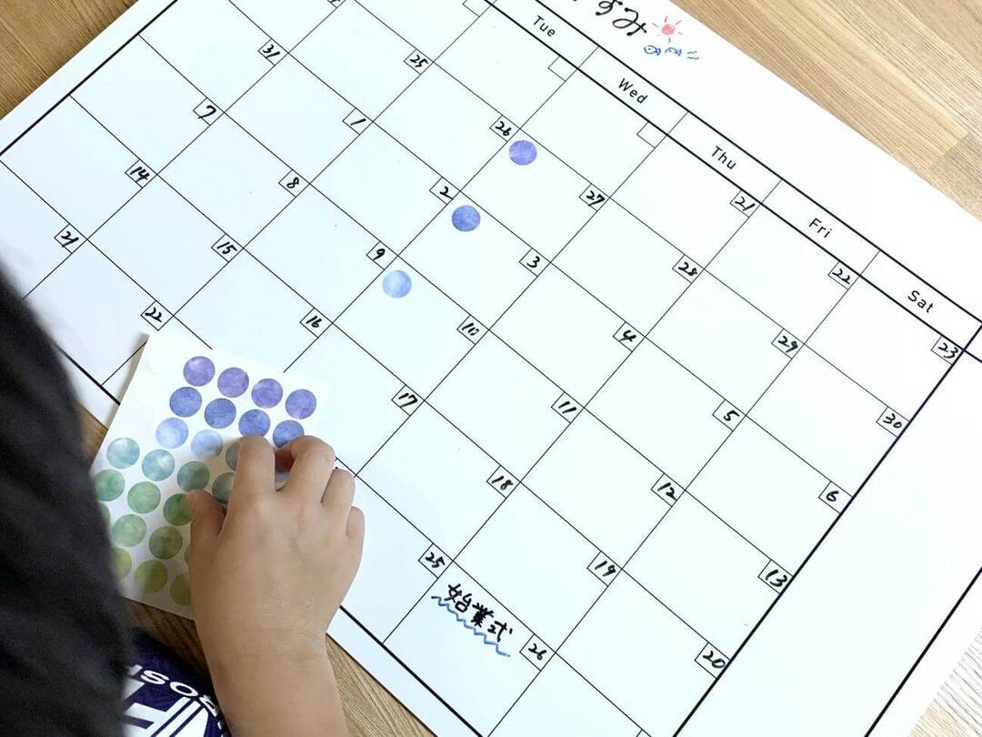 夏休み期間中は習い事がお休みだったり別日に変更になったりするので、息子に印をつけて分かりやすくしてもらいます。このときに先程のシールが大活躍!マスキングテープのような素材だと貼り直しやすくて便利でしたよ。