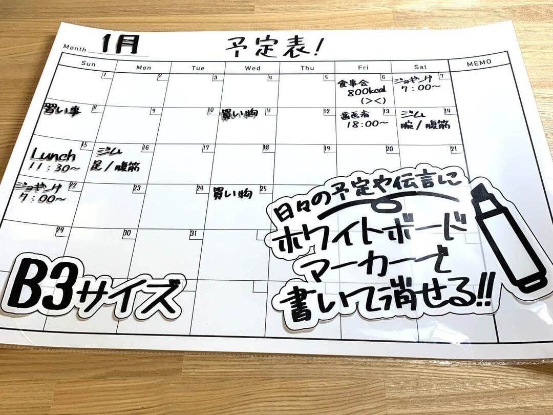 大きさは、約36.5cm×約51.5cmのB3サイズ。一日分のマスも十分すぎるくらい広いので、家族全員の予定を書き込めそうです。