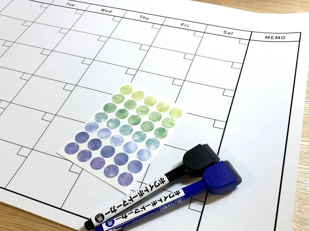 今回はスケジュールシートと一緒に、ホワイドボード用マーカーとシールも用意してみました。どちらも100円ショップによくある商品なので、併せて買っておくと便利です。