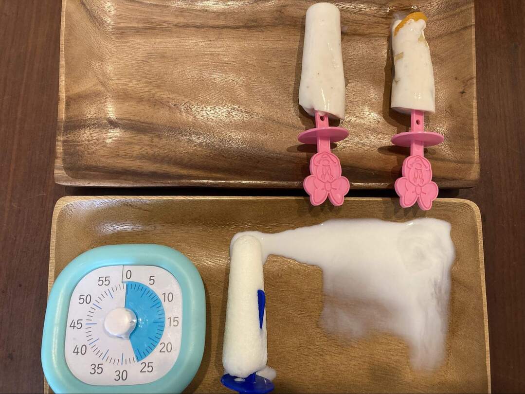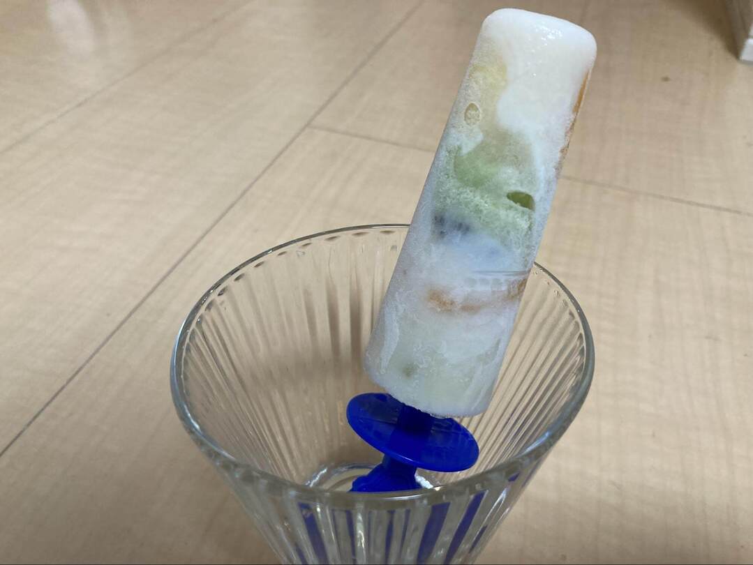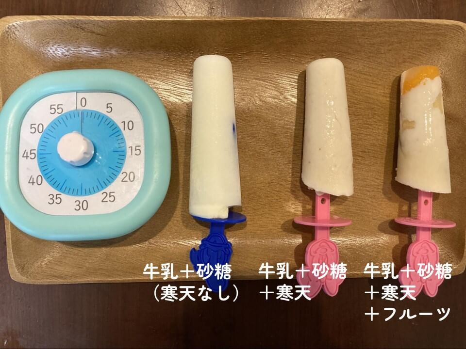 ちなみに、寒天を入れて作ったアイスのうちフルーツ入りが溶けた理由は、アイスキャンディメーカーの底に缶詰フルーツのシロップがたまり、寒天液があまり混ざらない状態で凍ったためと考えられます。写真をよく見ると、溶けているのはアイスの先端の方だけですよね。