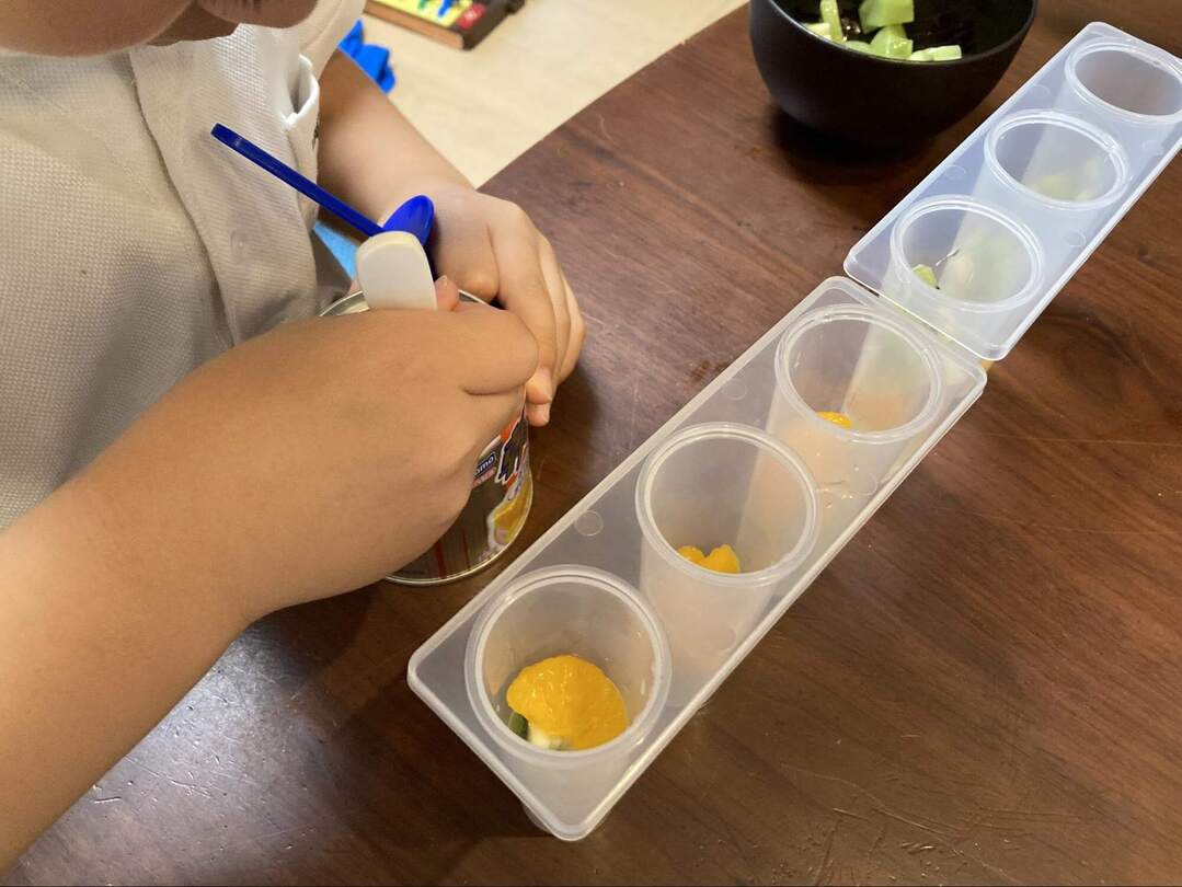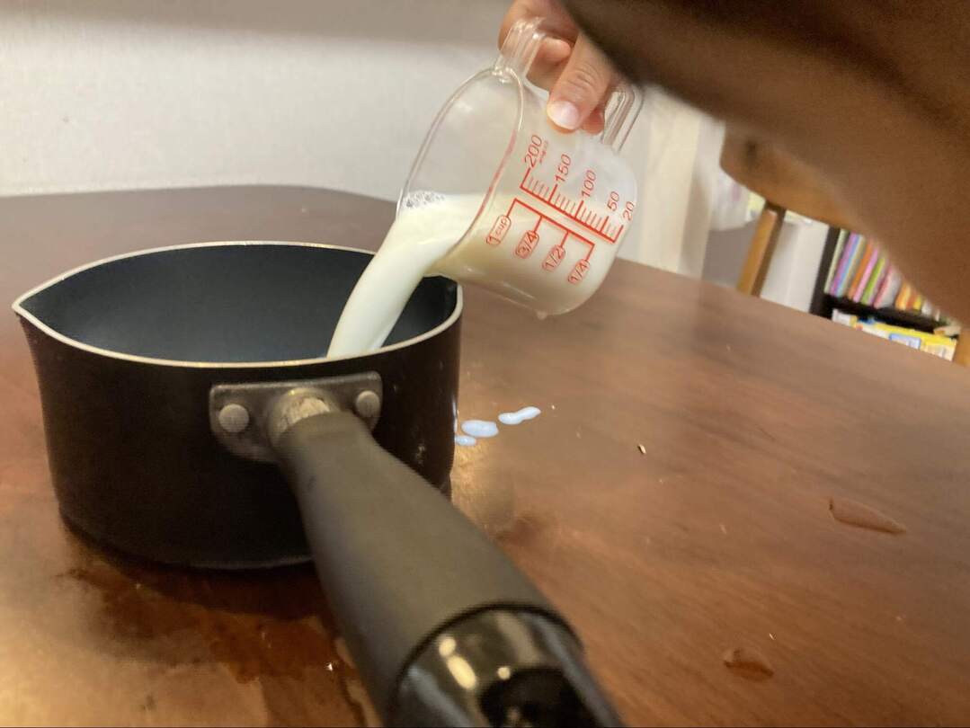 「牛乳400mlだから200mlを何回入れればよいでしょう?」と声かけ。小学校で学ぶ「かさ」の理解の種まきになります。カルピスなどを作るときも、軽量カップで自分で計って作ってみるといいですね。