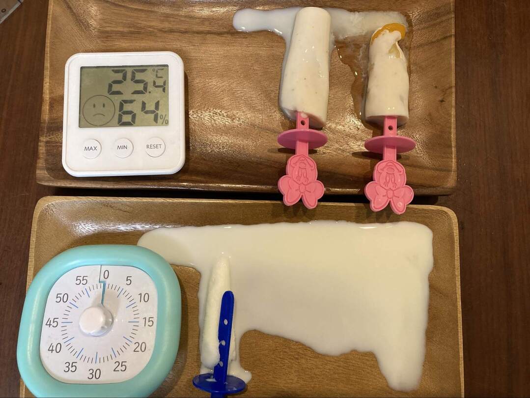 室温に置いて、一番左のアイスキャンディだけが溶けて右の2本が溶けなければ、寒天が溶けないことに影響していると考えられますね。