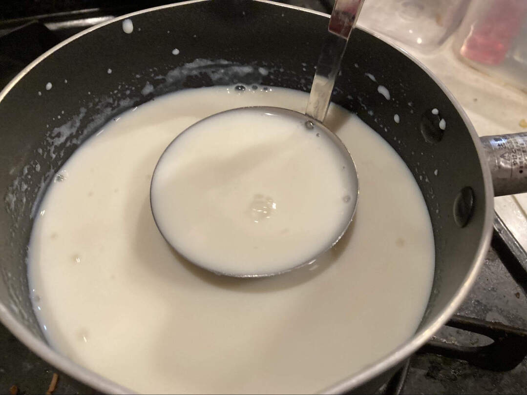 ポイント:寒天は90度以上で溶けるため、軽く沸騰させることが必要です。沸騰しはじめたらすぐ弱火にして、焦げないように注意!わが家は焦がしてしまい、ザルでこしました…反省。