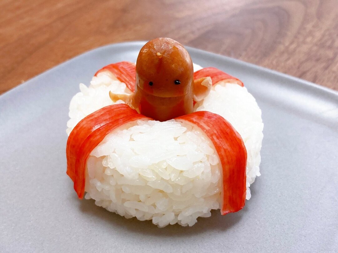 おにぎりに、かに風味かまぼこの赤い部分をのせて浮き輪の模様のように作ります。タコさんを穴に入れれば完成!