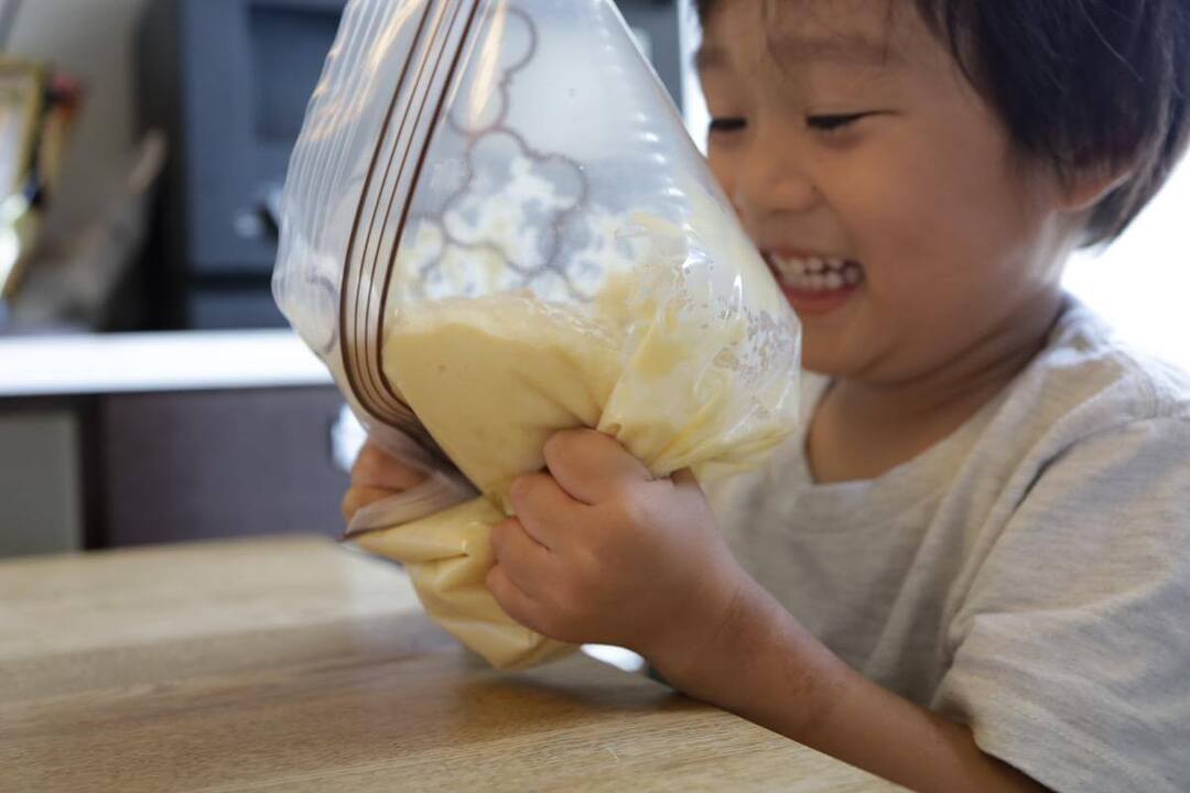 まずは生地作りです。息子もお手伝いしやすいよう、ボウルではなくジップ付きの保存袋を使用しました。