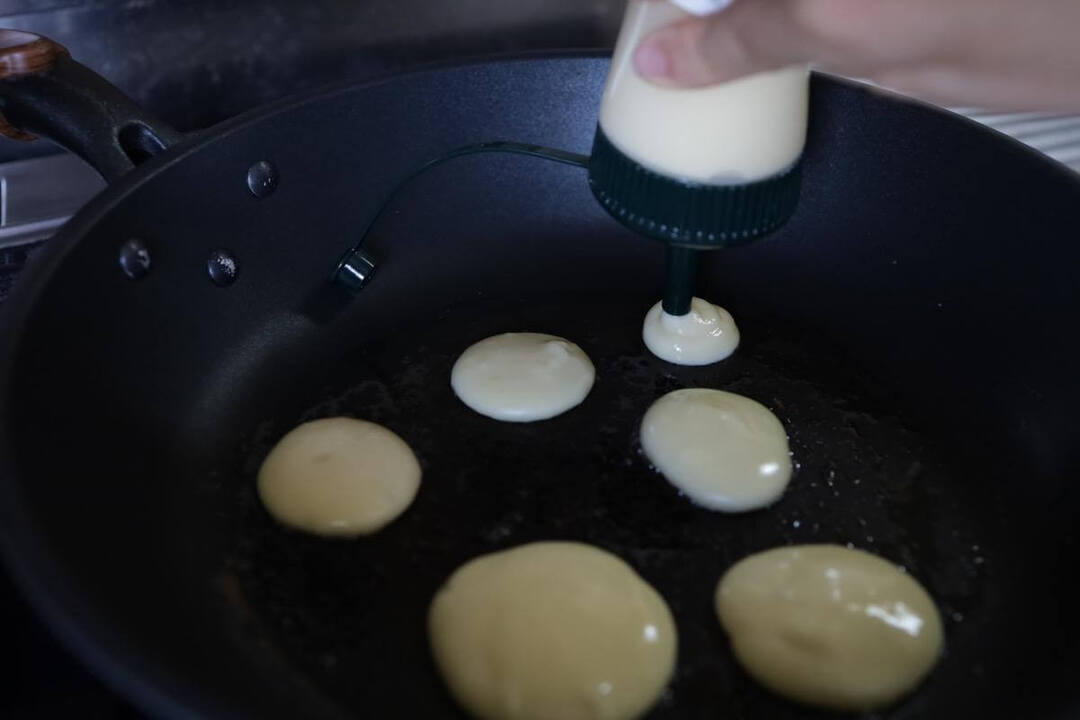 「ソースボトル」を使えば、不器用さんでも簡単にきれいなまんまるミニパンケーキを作ることができます。サイズが小さいぶん、いつものパンケーキよりも火が通りやすく、ひっくり返しやすいのもうれしいポイントです。手づかみ食べを始める、 離乳食後期の赤ちゃんにもおすすめですよ。