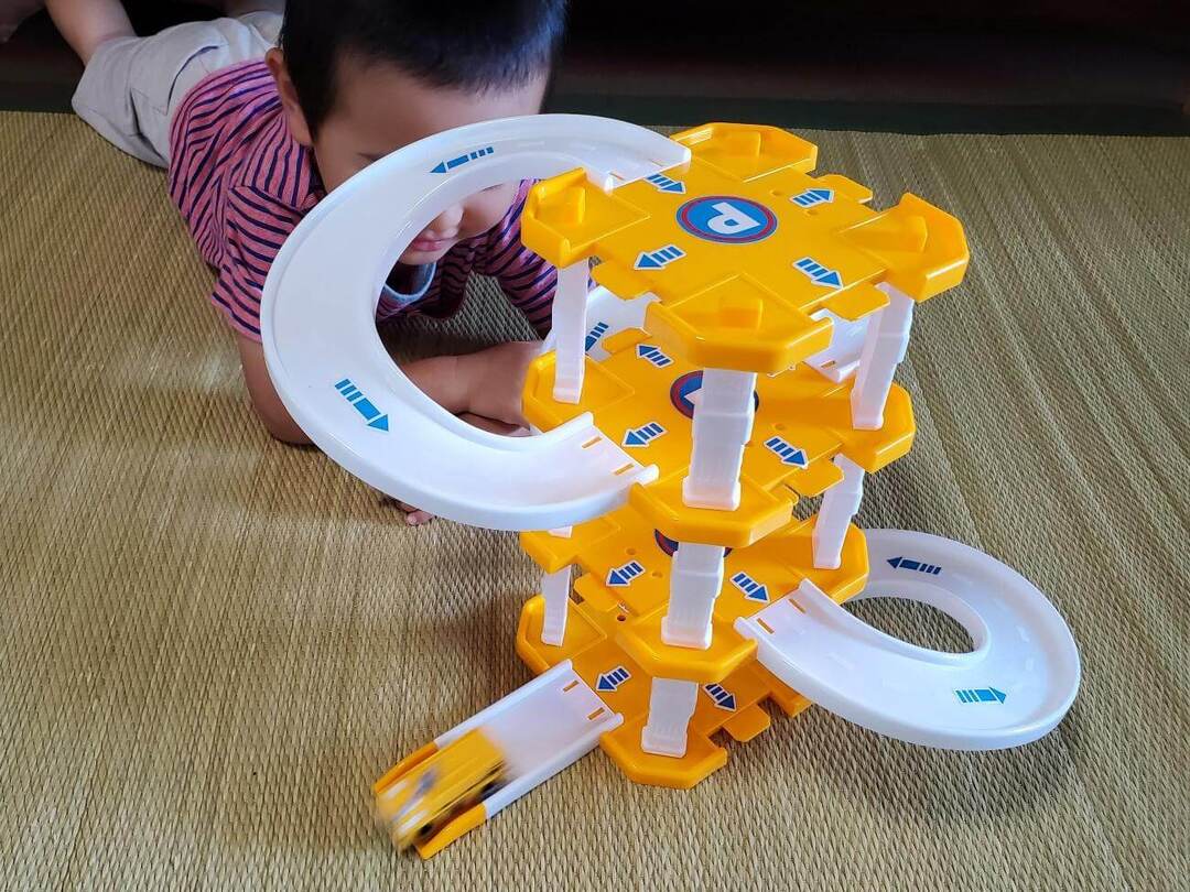 上から車をすべらせると、止まることなく勢いをつけて1階まで走っていきます。