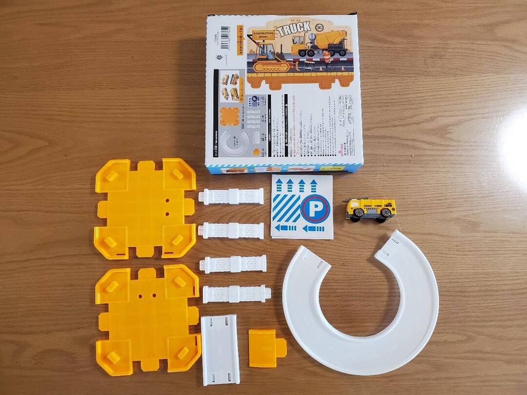 箱の中身はこんな感じ。立体駐車場のパーツほかに、付属の車が4種類のうちランダムで1つ入っています。
