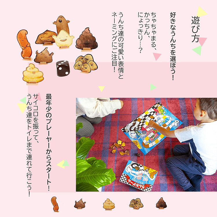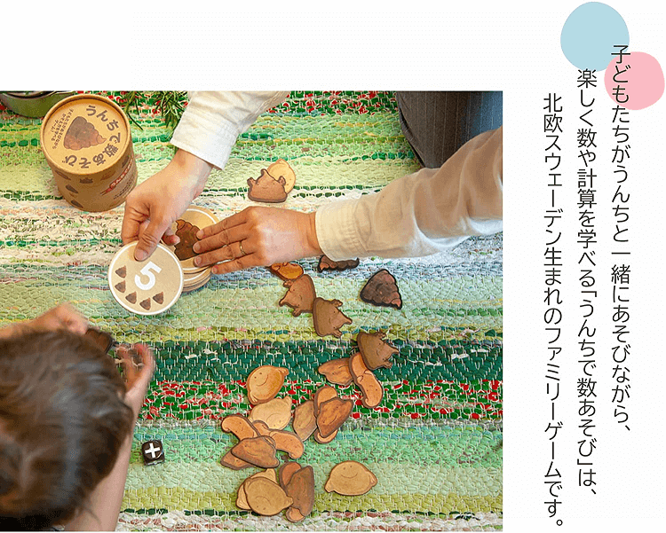 なぜか子どもゴコロをとらえるうんちをモチーフに、遊びながら、数え方を学べるゲーム。 うんちピースとナンバーカード、「+」「−」の書かれたサイコロを使って、色々な数や計算ゲームを楽しめます。おならの音を出すというルールもあり、子どもたちはきっと大爆笑するはず!