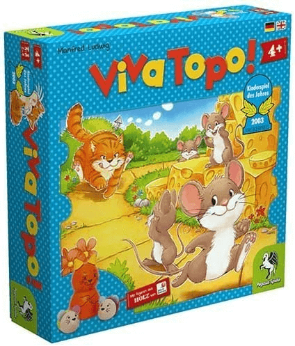 ドイツのゲーム専門会社・ペガサス社のすごろくゲーム。プレイヤーは2人~4人。やさしいイラストが描かれたゲーム盤に、木製のねこ、ねずみの駒と、チーズ、さいころがセットになっています。