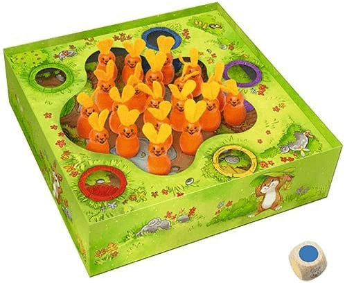 ある気持ちの良い夏の日、突然大雨が降ってきました。うさぎたちの巣穴が水浸しになり小さなうさぎたちは足元まで濡れてしまっています。うかうかしていると、おぼれてしまう!プレイヤーは、外に通じる5つの出口からうさぎたちを脱出させ、誰が一番たくさんのうさぎを助けてあげられるかを競います。ゲーム盤に、20匹の愛らしいうさぎとサイコロがセットになっていて、2人~5人まで楽しめます。