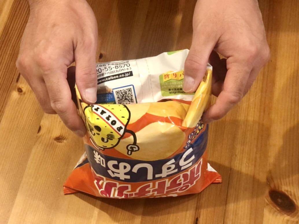 はじめに、開封前のスナック菓子をひっくり返します。両角を内側に折りこみ、底部分をギュッと押し込んでいきましょう。