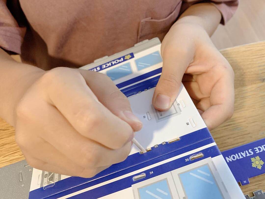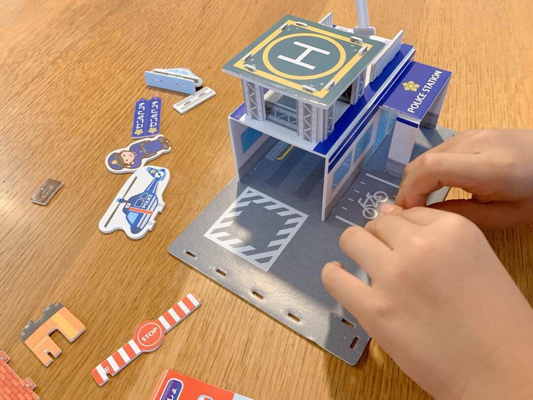 パーツの切り離し&組み立て作業合わせて、15分ほどで警察署が完成。警官やパトカー、ヘリコプターのモチーフがかわいい…!