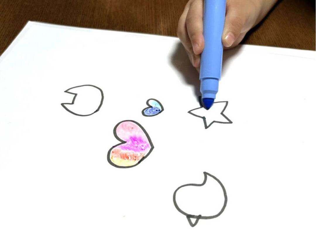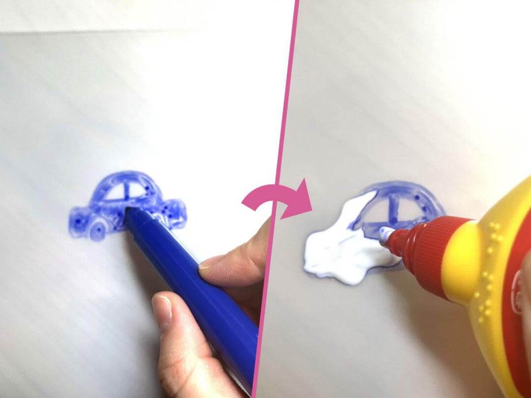 まずは、透明シートに水性ペンで好きな絵を描きます。描き損じた場合は、ティッシュで簡単に消すことができますよ。