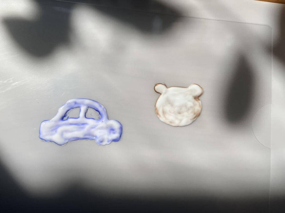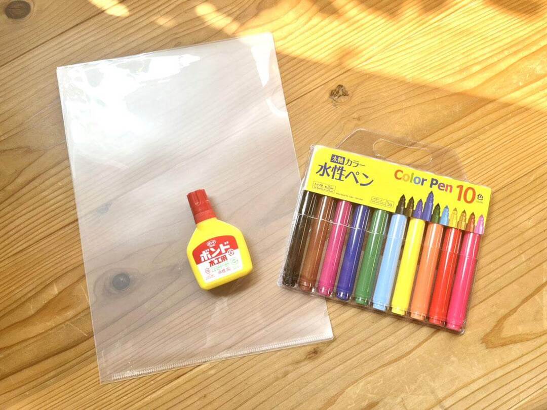 材料は木工用ボンド、水性の色ペン、ビニール製のツルツルした透明シート(ファイルや下敷きなど)のみ。すべて100均で手に入りますよ。