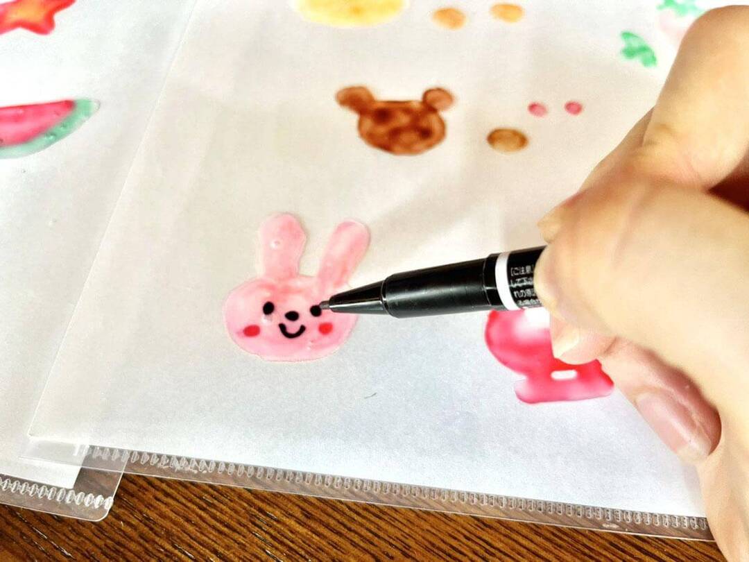 油性ペンで顔などのパーツを描き加えると、かわいさがグッと増しますよ。 あとは剥がせばぷっくりシールの完成!