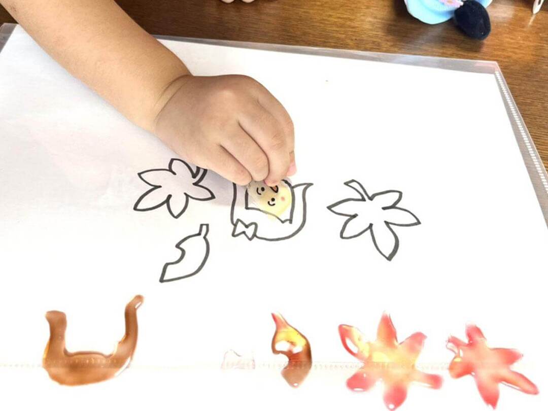 まだモチーフをうまく描けない小さな子どもの場合は、透明シートの下に見本のイラストを敷いてガイドを作ってぬりえの要領で描けるようにしてあげるといいかもしれません。