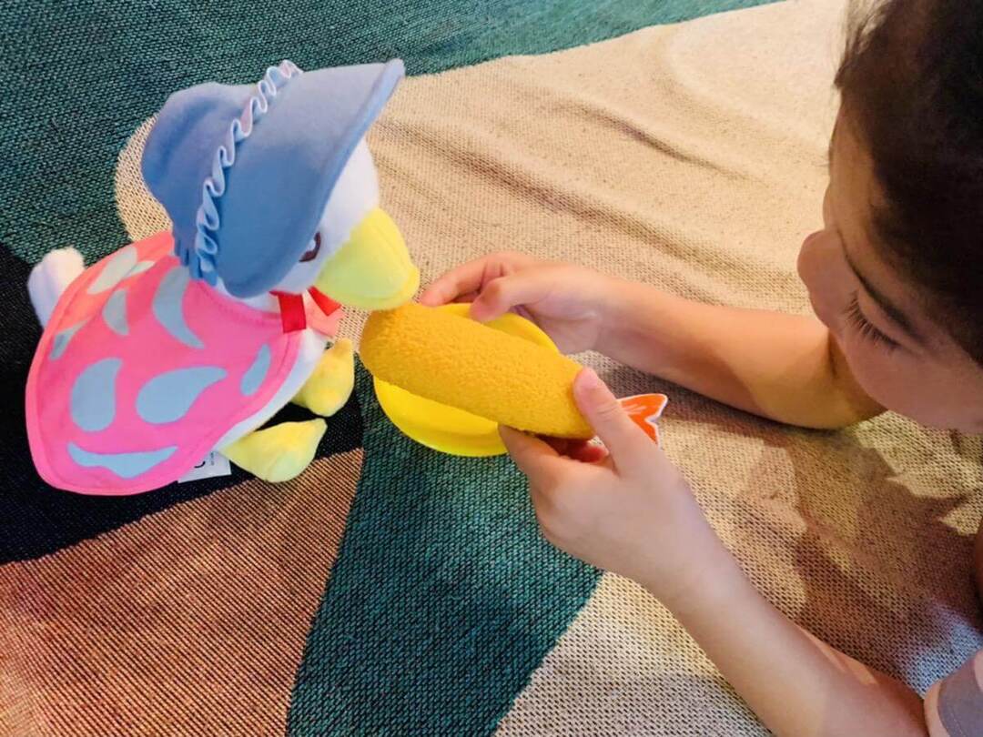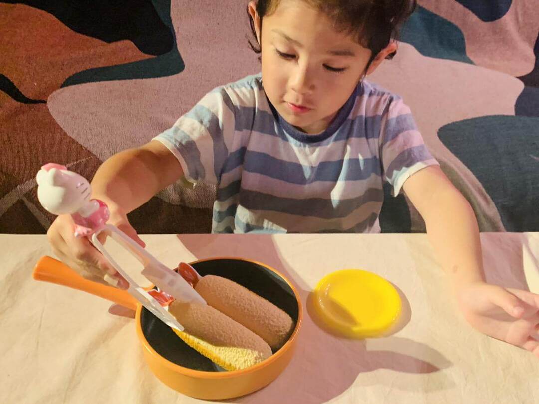 見た瞬間「エビフライだ~!」と大喜び!自宅にあったおもちゃの中から、フライパン・トング・お皿を持ってきて「揚げますよ」「ジュ~」と言いながらままごと遊びが始まりました。