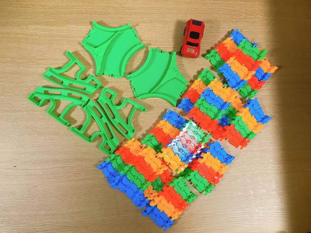 ミニカーが1個とくねっとロードのパーツ、橋を作るための傾斜台4つ、Uターンロードが2個という内容です。くねっとロードのパーツは赤・黄色・緑・青の4色で各30個ずつ計120個も入っています。ある程度くっついた状態で入っているので、開封後にすぐに道路が作れますよ。