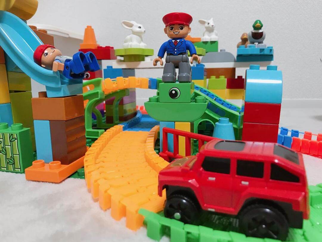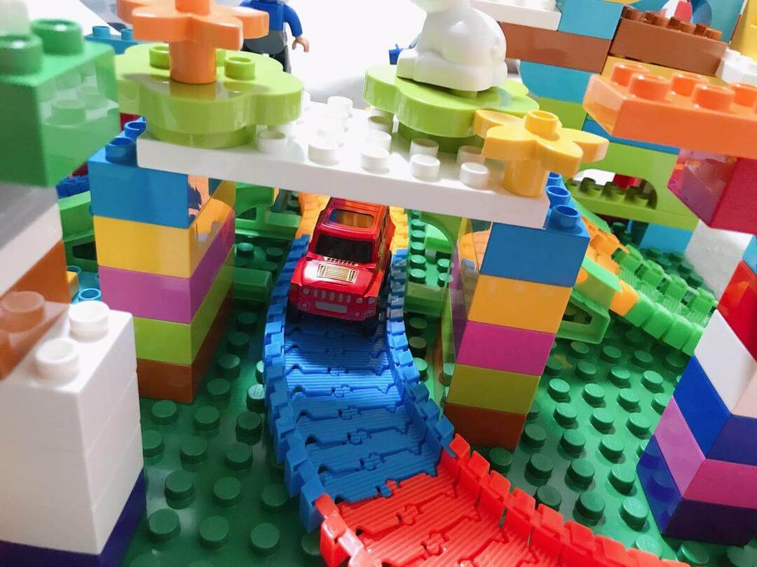 レゴの橋の下をビューンと走ってくぐります。このように、おうちにあるレゴなどのブロックと組み合わせれば、かなりの大作ができて楽しめますよ◎