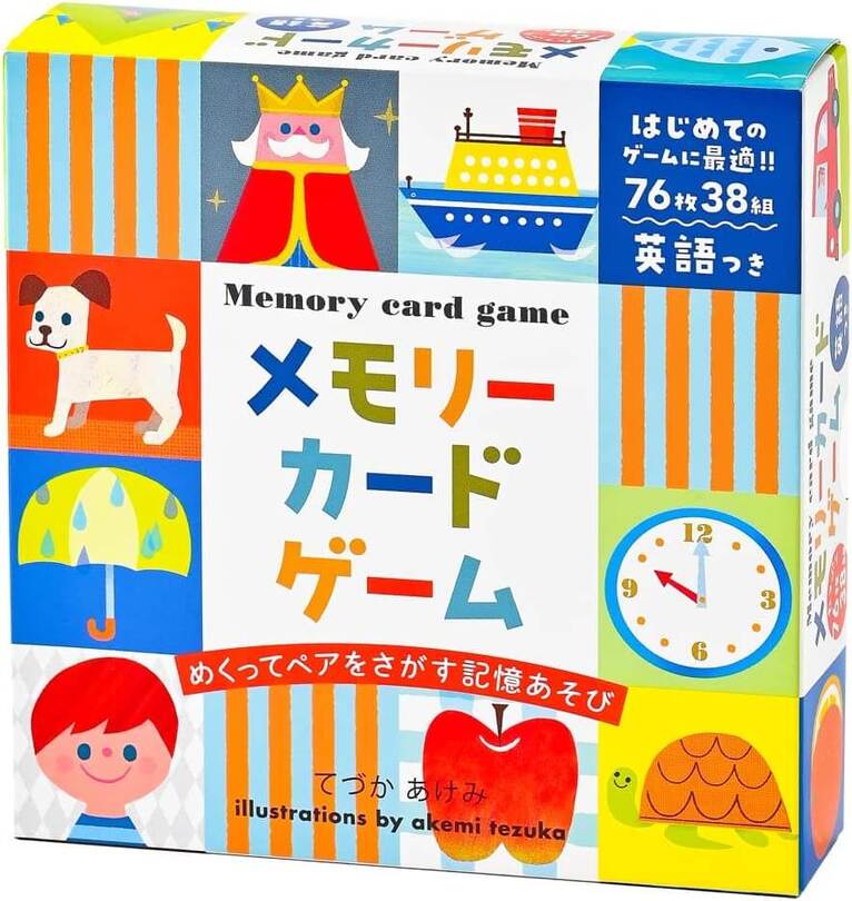 神経衰弱の要領で、めくってペアをさがす「メモリーカードゲーム」。まぎらわしい絵も隠れているので、シンプルなルールながらも飽きずに遊べるのが魅力。記憶力や集中力を引き出してくれるのはもちろん、イラストには日本語と英語でものや生き物の名前が表記されていて、遊びながら英語に触れ合うことができます。