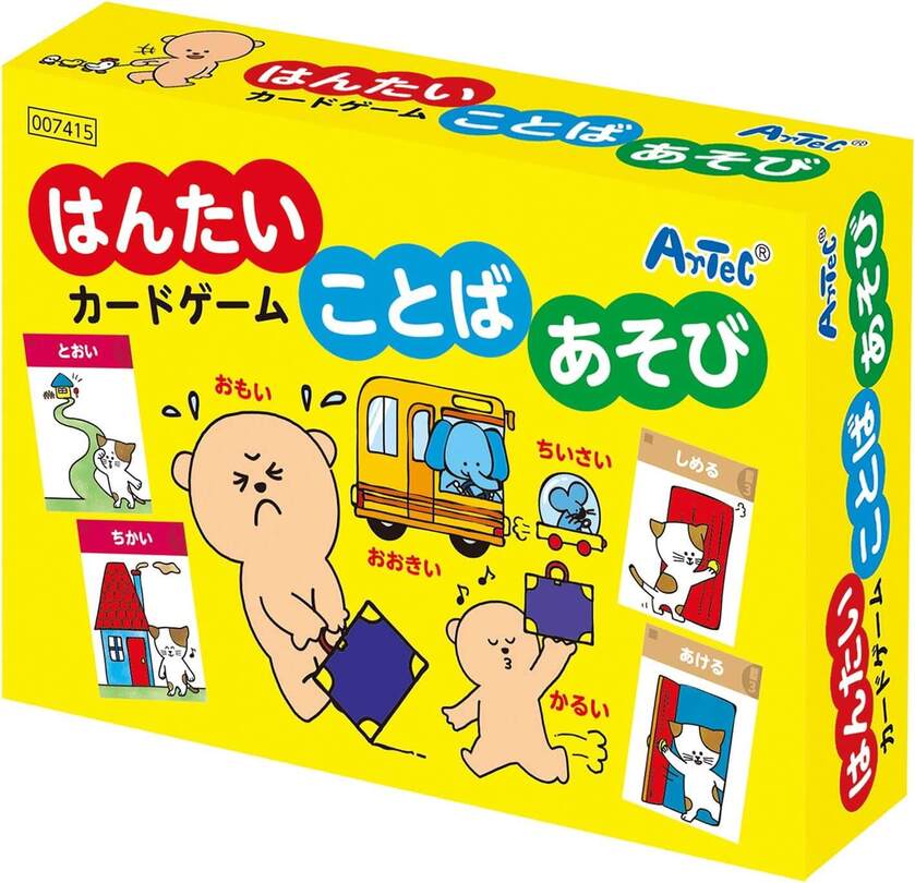 おおきい・ちいさい、かるい・おもいなどの反対言葉とかわいい動物が描かれたカードを使って、3種類の遊び方ができる「はんたいことばあそびカードゲーム」。言葉とその意味が伝わりやすいシンプルなイラストは、語彙力を伸ばしたい子にもぴったりです。