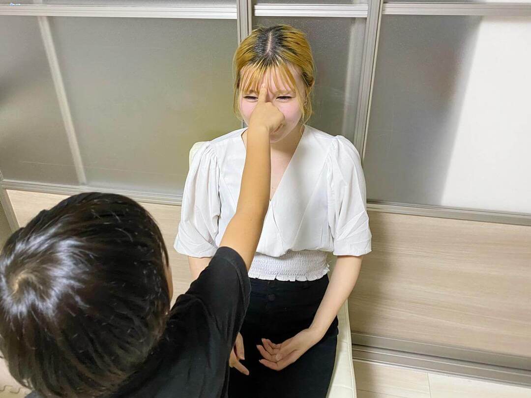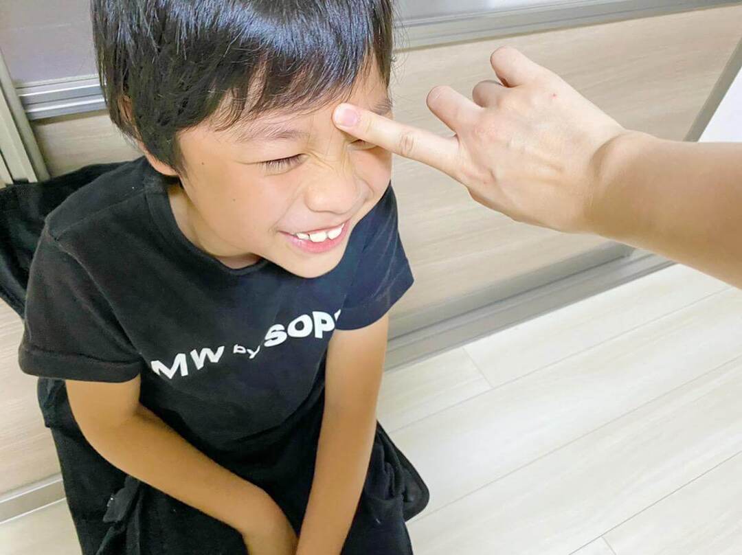 つぎに、おでこの真ん中に人差し指を1本当てます。これで準備完了です!指を当てる人はとくに力を入れる必要はありません。