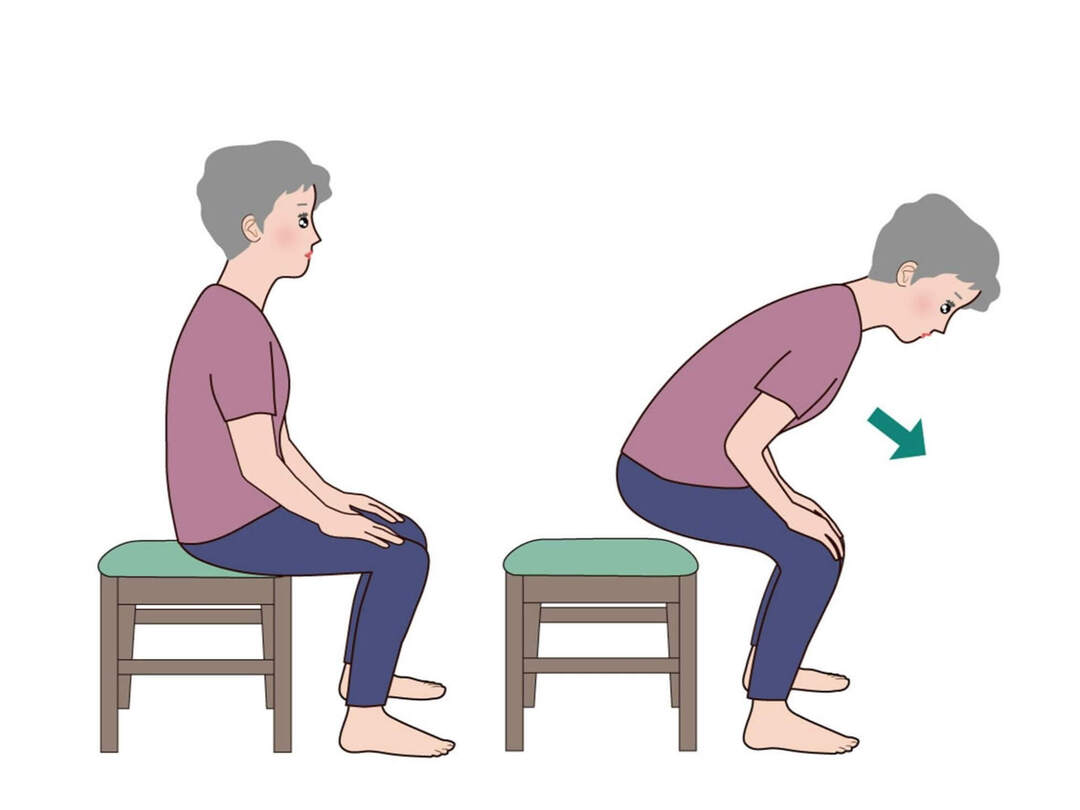 イスから立ち上がるには、おしりのあたりに落ちている重心を上半身を倒して前(足の部分)にもってくる必要があります。