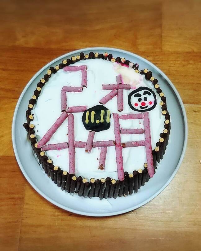 chikachikattyさんが作ったのは記念日ポッキーケーキ。周囲をスタンダードなチョコポッキーで囲い、いちご味で文字のデコレーションもしています。
