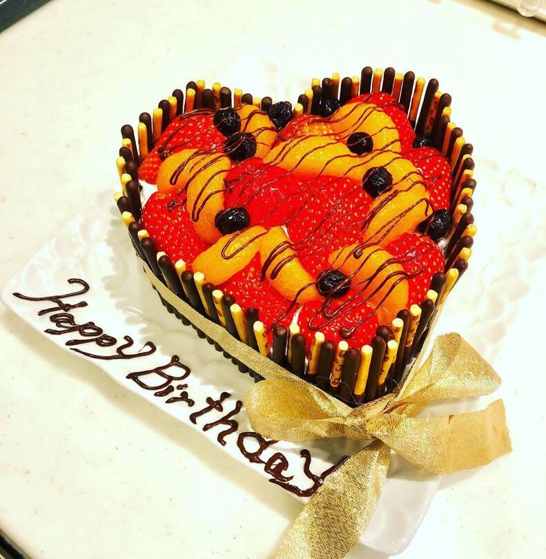 ケーキの真ん中に盛られたチョコレートがけのフルーツやゴールドのリボンがゴージャスで、まるでお店で購入したかのような完成度の高さです。