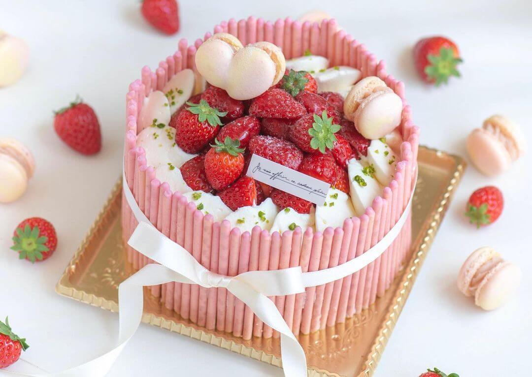 いちごのショートケーキ×いちごのポッキーと、いちご尽くしのポッキーケーキ。トッピングのベビーピンクのマカロンもとってもキュートで、乙女ゴコロをくすぐります。