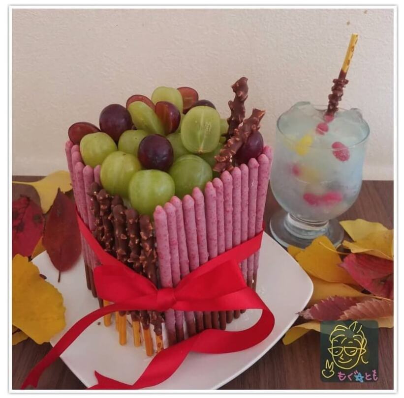 mogu.tomo65さんが作ったのはブドウたっぷりのポッキーケーキ。つぶつぶいちごポッキーとアーモンドクラッシュポッキーの組み合わせがとってもオシャレ!