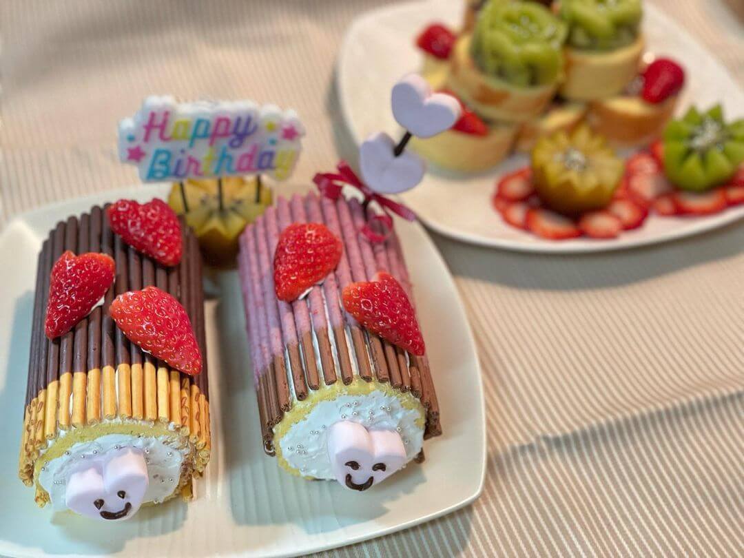 生クリームたっぷりのロールケーキに、顔つきのハートマシュマロ&ハート型のいちごをトッピング。愛情がぎゅっと詰まっていますね!
