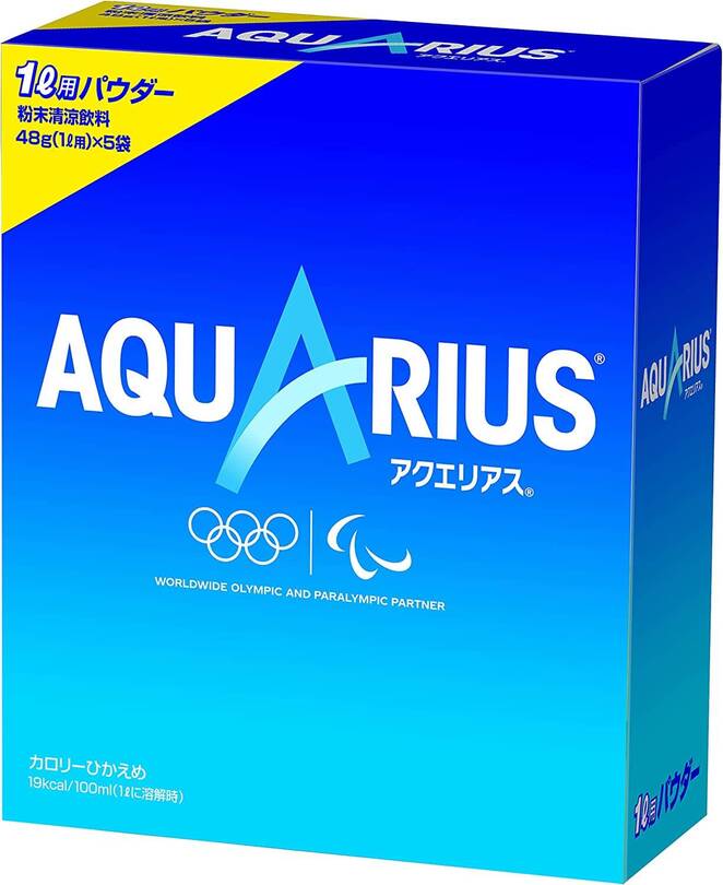 こちらは1箱で1Lペットボトル5本分のアクエリアスが作れるパウダータイプ。発熱や発汗で失われる水分やミネラルを効率良く補給してくれます。