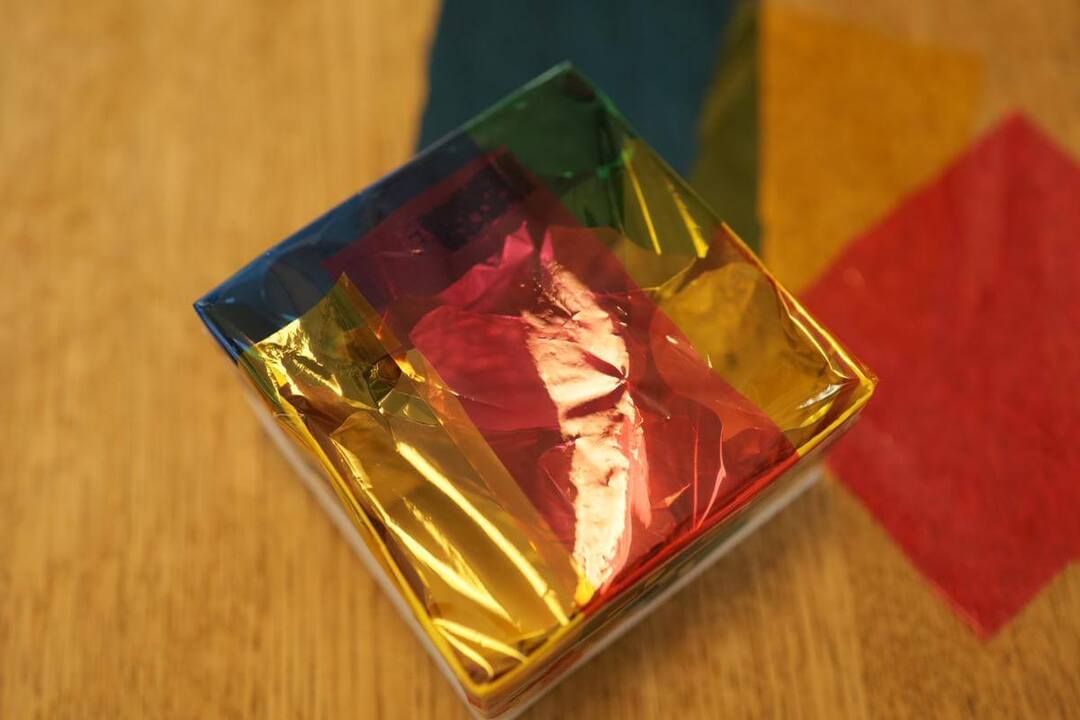 クッキングペーパーの面と異なり、こちらは多少シワが入っても大丈夫!ところどころカラーセロハンを重ねると、透かしたときにきれいです。