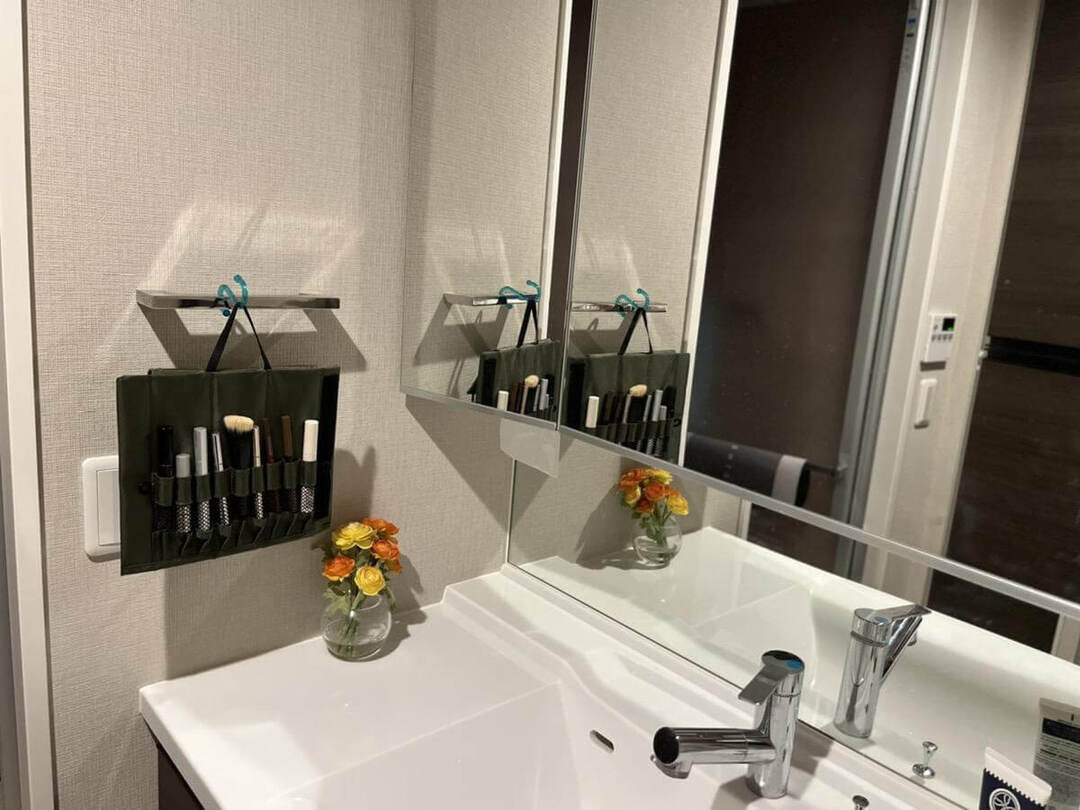最後はメイク道具の吊り下げ収納!こちらも子どもには触らせたくないので、さっとまとめて片づけられるのが◎。使いやすいうえに洗面所もスッキリ片づきます。折りたためばこのまま旅行にもいけちゃいそうですね。