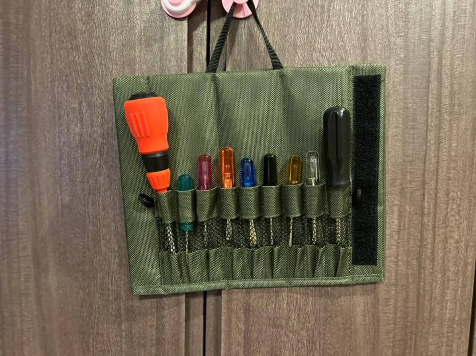 ドライバーなどの工具もピッタリ収納できます。必要なものがすぐわかり、取り出しも簡単!子どもの手の届かないところに吊り下げればさらに安心ですね。