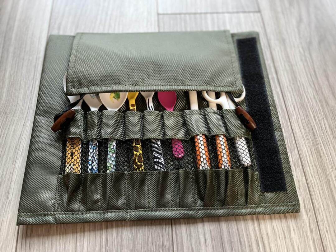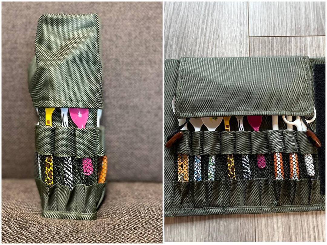 スプーンなどのカトラリーが9つのポケットに収納できるようになっています。サイズは23cm×0.5cm×27cm。
