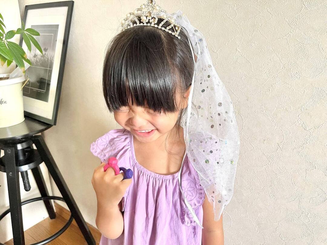 娘はベールとティアラをつけてプリンセスごっこを楽しんでいました。お店屋さんごっこや人形遊びにもいいかもしれません。