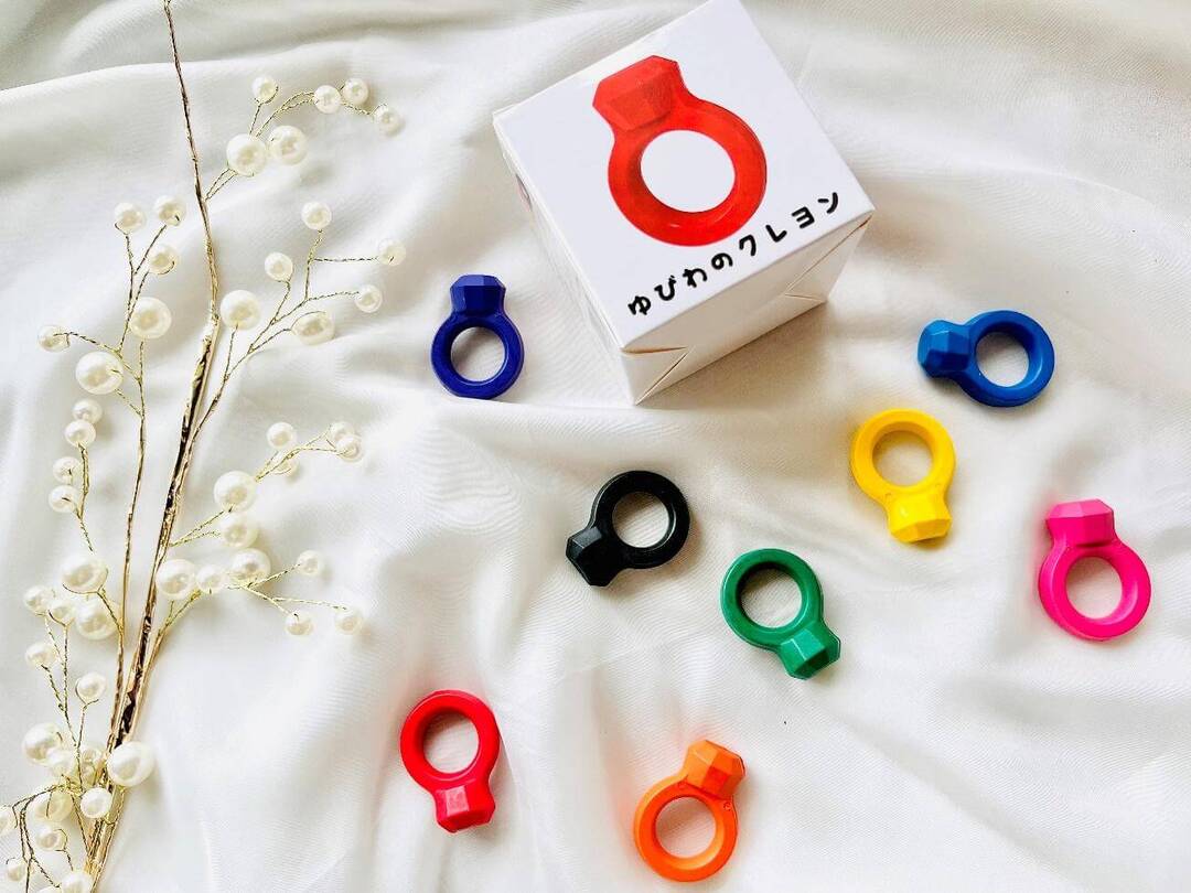 「ゆびわのクレヨン」は、その名のとおり指輪をモチーフにしたクレヨン!くろ、あか、だいだい、きいろ、みどり、あお、むらさき、ももいろの8色入って110円(税込)です。