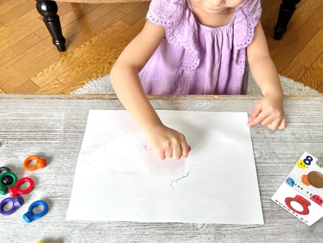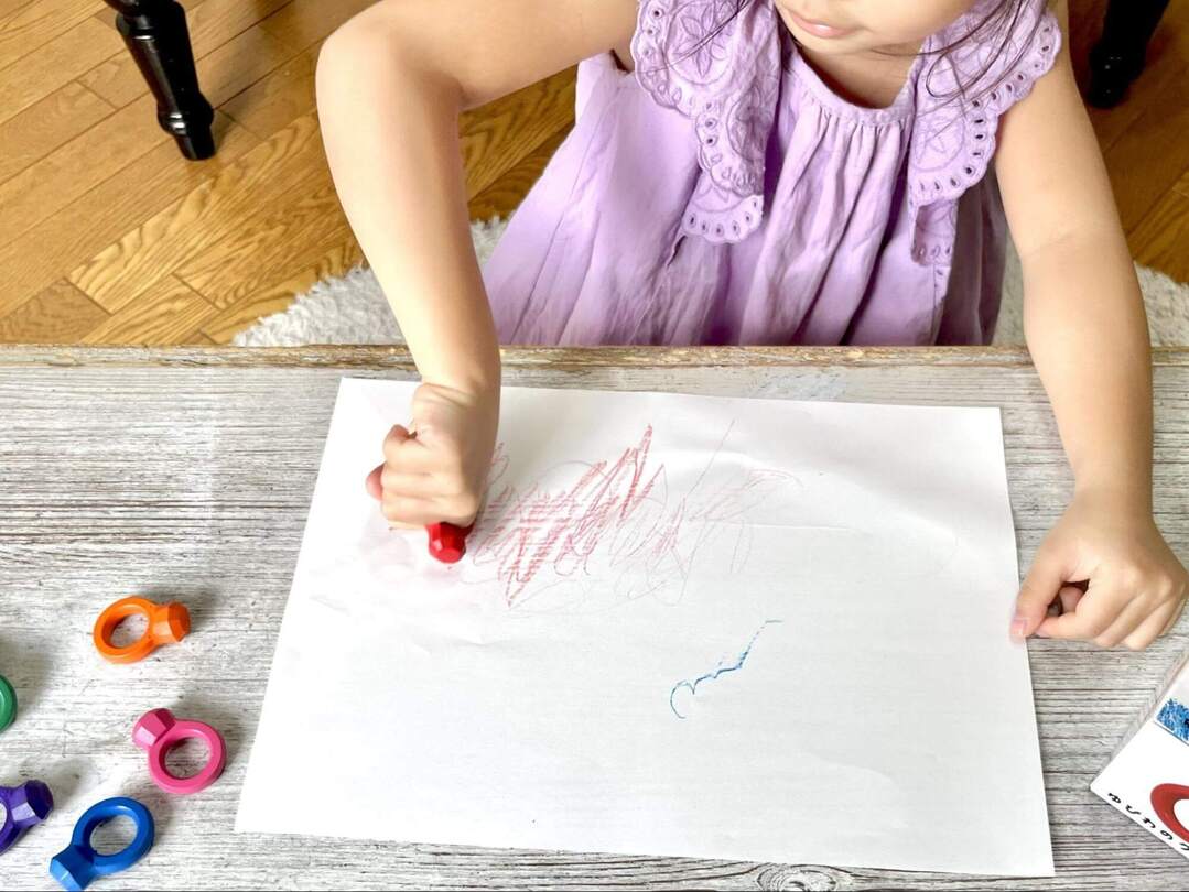 ゆびわ型クレヨンに「かわいい〜気に入った♡」と娘は大喜び!さっそくお絵描き開始です。