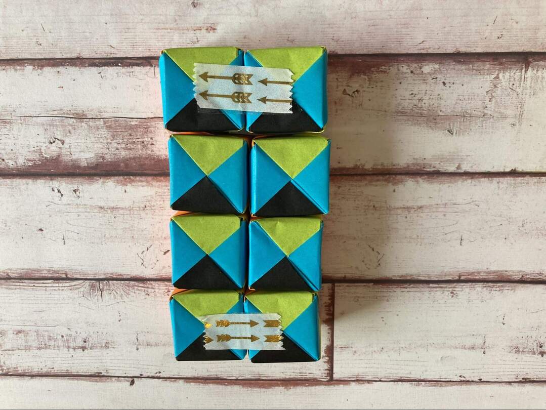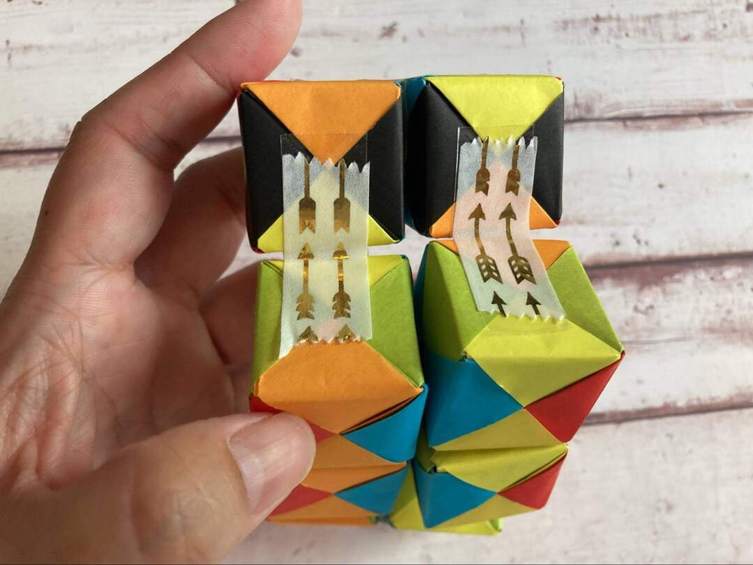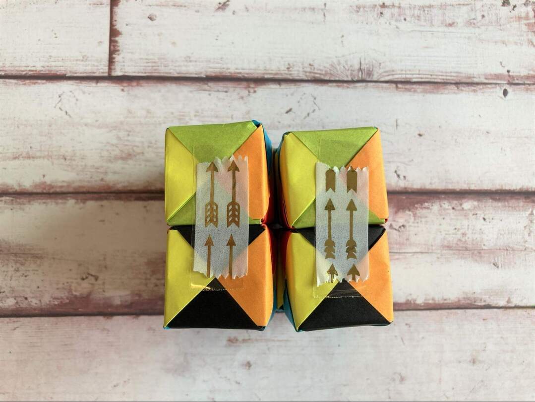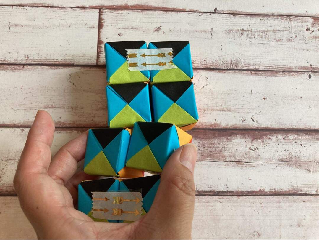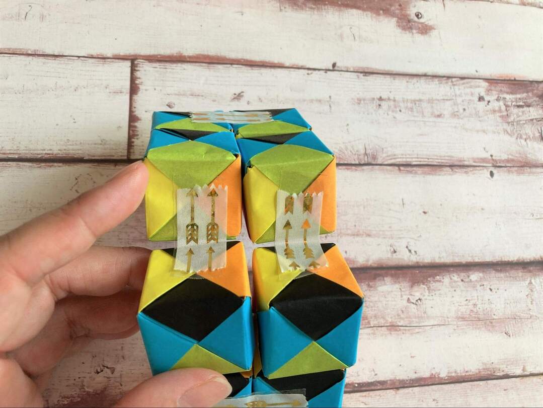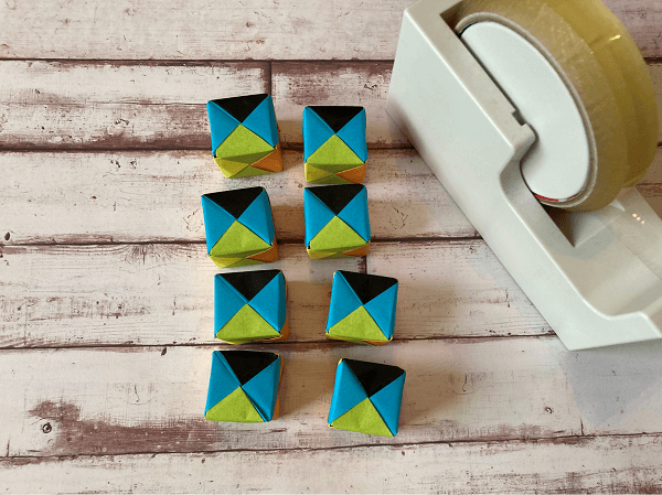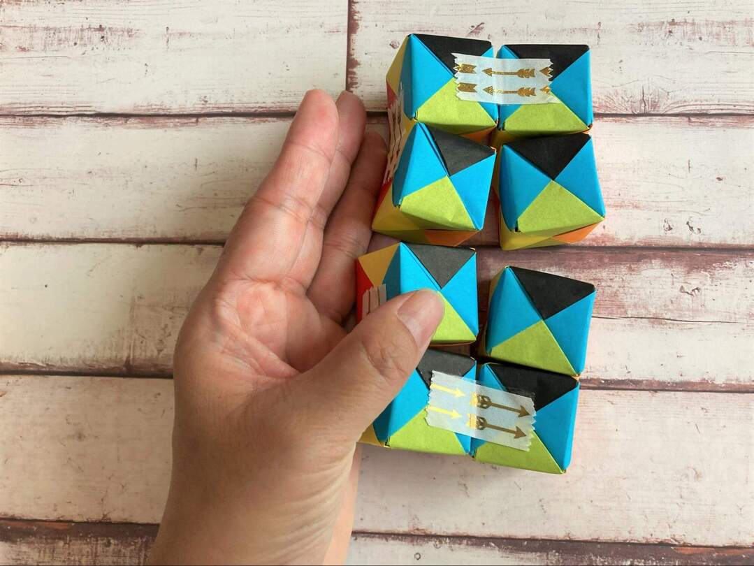 8個のキューブができたら、いよいよテープでつなげていきます!面の色を揃えたい場合には、ここで揃えて置くようにします。